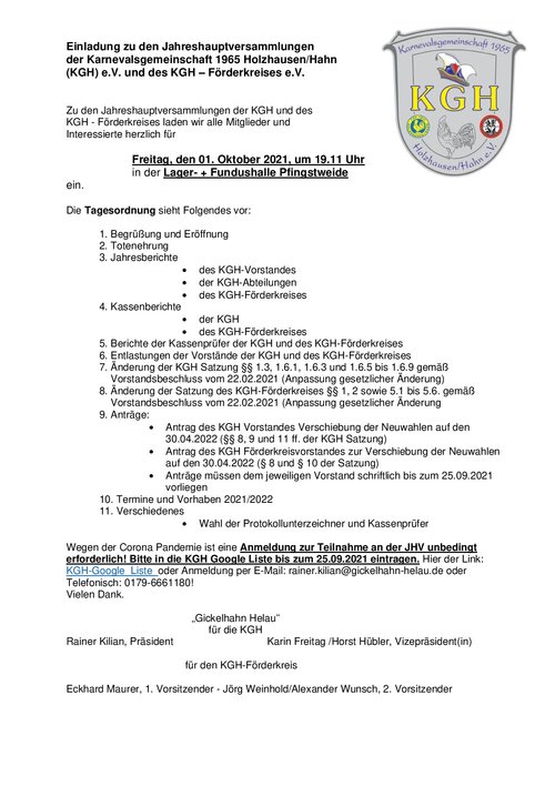 23.10.20, 19.11 Uhr - Jahreshauptversammlungen von KGH und KGH-Förderkreis